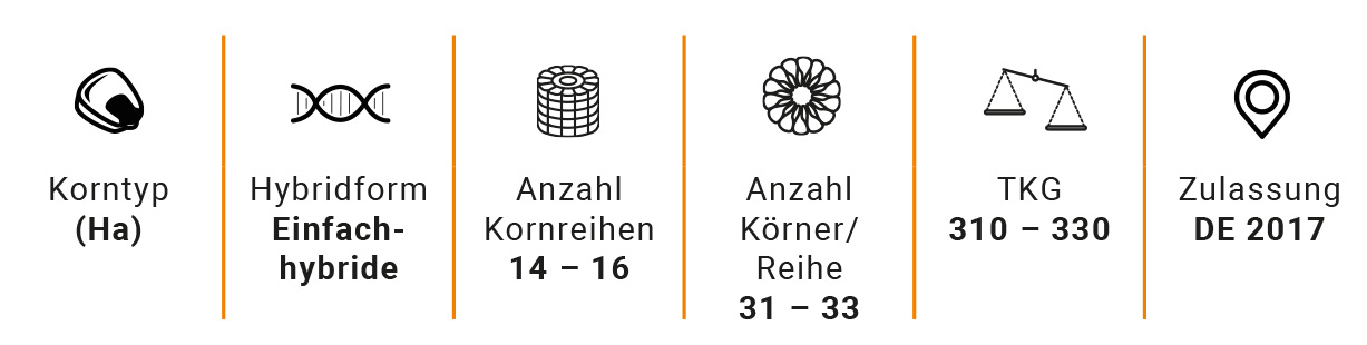 Dieser mittelfrühe, ertragsstarke Körnermais überzeugt mit gutem Dry Down, hochwertiger Silagequalität, hoher Trockentoleranz und ausgeprägter Gesundheit bei sehr guter Standfestigkeit.