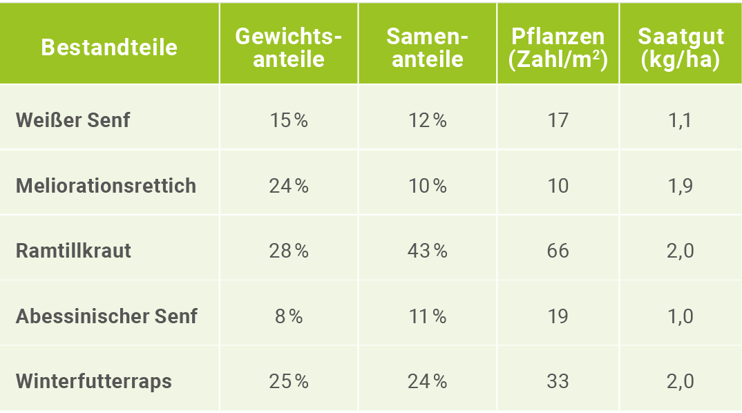Die Mischung garantiert eine sichere Etablierung auf allen Standorten, überzeugt durch hohe Konkurrenzkraft und Nährstoffaufnahme und sorgt dank Winterfutterraps für eine ganzjährige Begrünung.